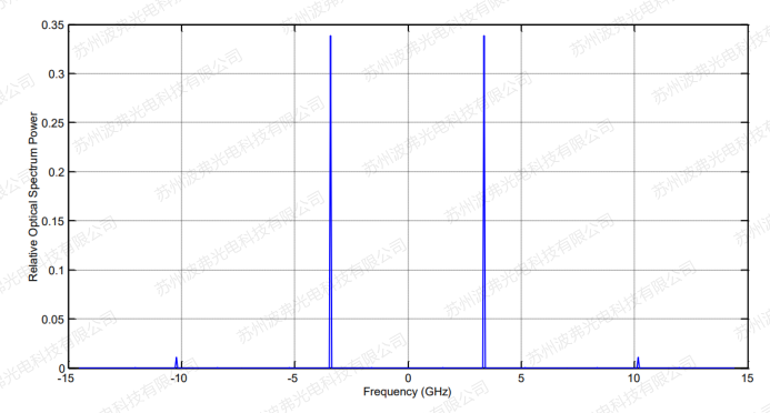CS-SSB情況下,下圖為強度調制器在Min點時的輸出光譜的模擬計算結果,載波在”0”所處位置消失,±1階邊帶清晰可見,±3階邊帶少許出現。