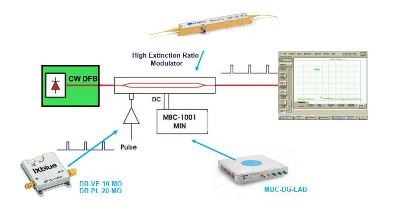 直流偏壓點的漂移可以使用iXblue的MBC(調制器自動偏壓控制器)解決方案進行主動監測和控制:臺式儀器MBC-DG-LAB或MBC-DG-board鎖定用于脈沖應用的Mach-Zehnder調制器的工作點。