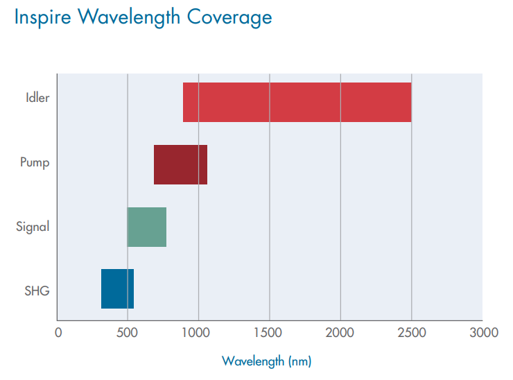 基于RadiantisTM專利技術,InspireTM可在345–2500 nm的光譜范圍內無間隙地提供具有高平均功率的接近變換限制的脈沖。憑借一套光學器件和一個標準配置,Inspire?的獨特設計提供了對整個系列的一流訪問,無需更改配置并確保同時訪問可見光和紅外光。四個獨立的輸出端口提供一流的光譜覆蓋范圍,包括雙泵浦(345–520 nm)、信號(490–750 nm)、惰輪(930–2500 nm)和耗盡泵浦(640–1040 nm)。