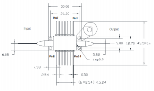 1550nm波段-20dBm飽和輸出功率-30dB增益-蝶形封裝-單模光纖-FC/APC接頭 |